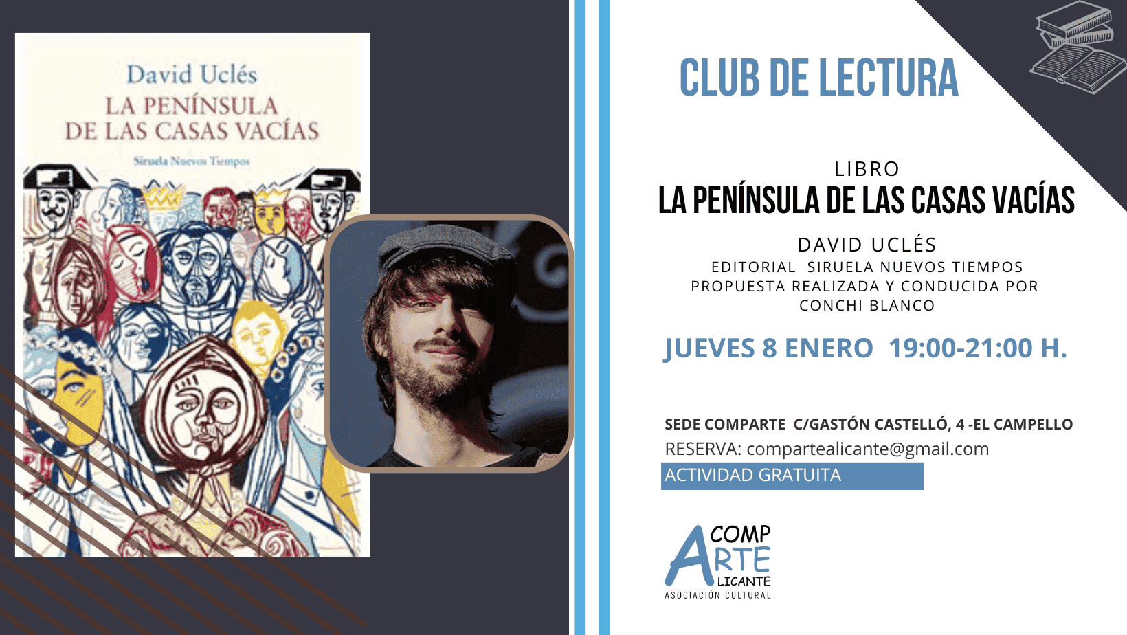 El jueves 8 de enero a las 19:00 horas, nos complace invitarte a un nuevo encuentro de nuestro club de lectura. En esta ocasión, nos sumergiremos en la obra «La península de las casas vacías» del joven autor David Uclés