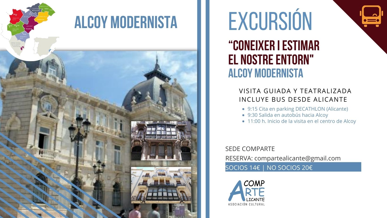 En esta primera salida hemos pensado que sería recomendable alquilar un autobús por la dificultad de aparcamiento en el centro de Alcoy. Además esto nos permitirá comenzar la jornada con el disfrute compartido de los asistentes sin tener que conducir.