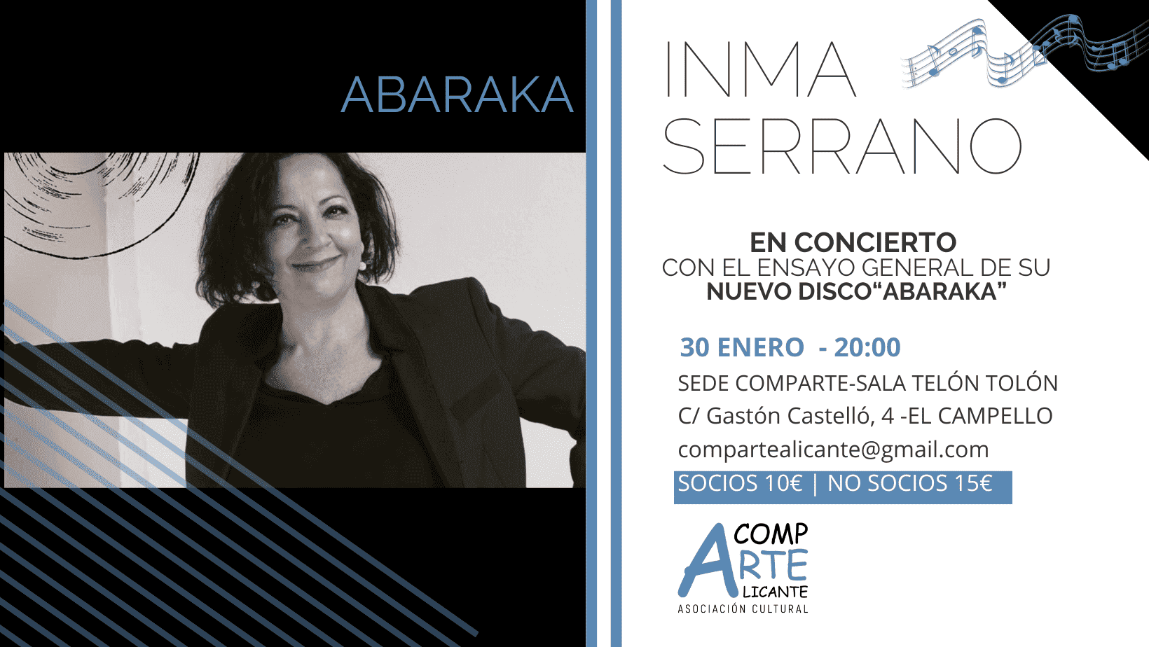Inma ha tenido el detalle no solo de ofrecernos su concierto en nuestra sala con pequeño aforo, sino que también nos comunica su intención de regalar una entrada para el concierto de la plaza de toros del 11 de julio de quienes adquieran en este mes de enero entrada para uno de estos dos conciertos que se celebrarán en las cuevas de Canelobre (el de Marina Rusell, previsto para el 25 abril y el suyo propio que será el 2 de mayo donde Inma Serrano grabará en directo los temas que escucharemos en nuestra sede)