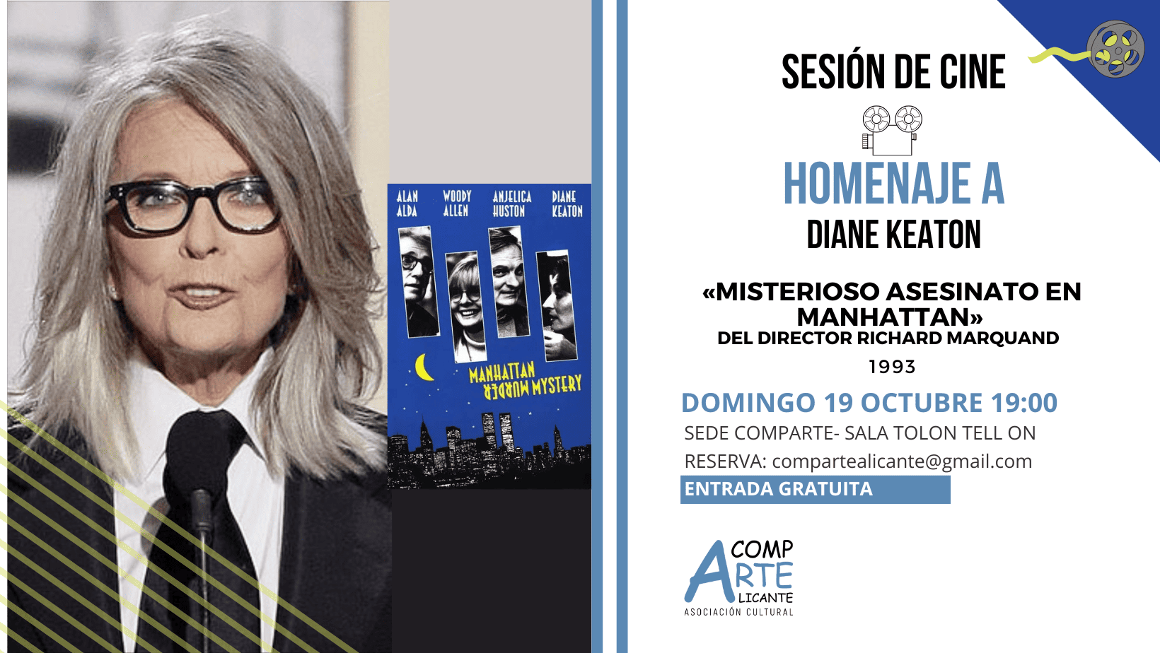 El próximo domingo 19 de octubre a las 19:00 h. proyectaremos la película «Manhattan Murder Mystery» (Misterioso asesinato en Manhattan) de Woody Allen como homenaje a la actriz, directora y productora Diane Keaton, fallecida el pasado 11 de octubre.
