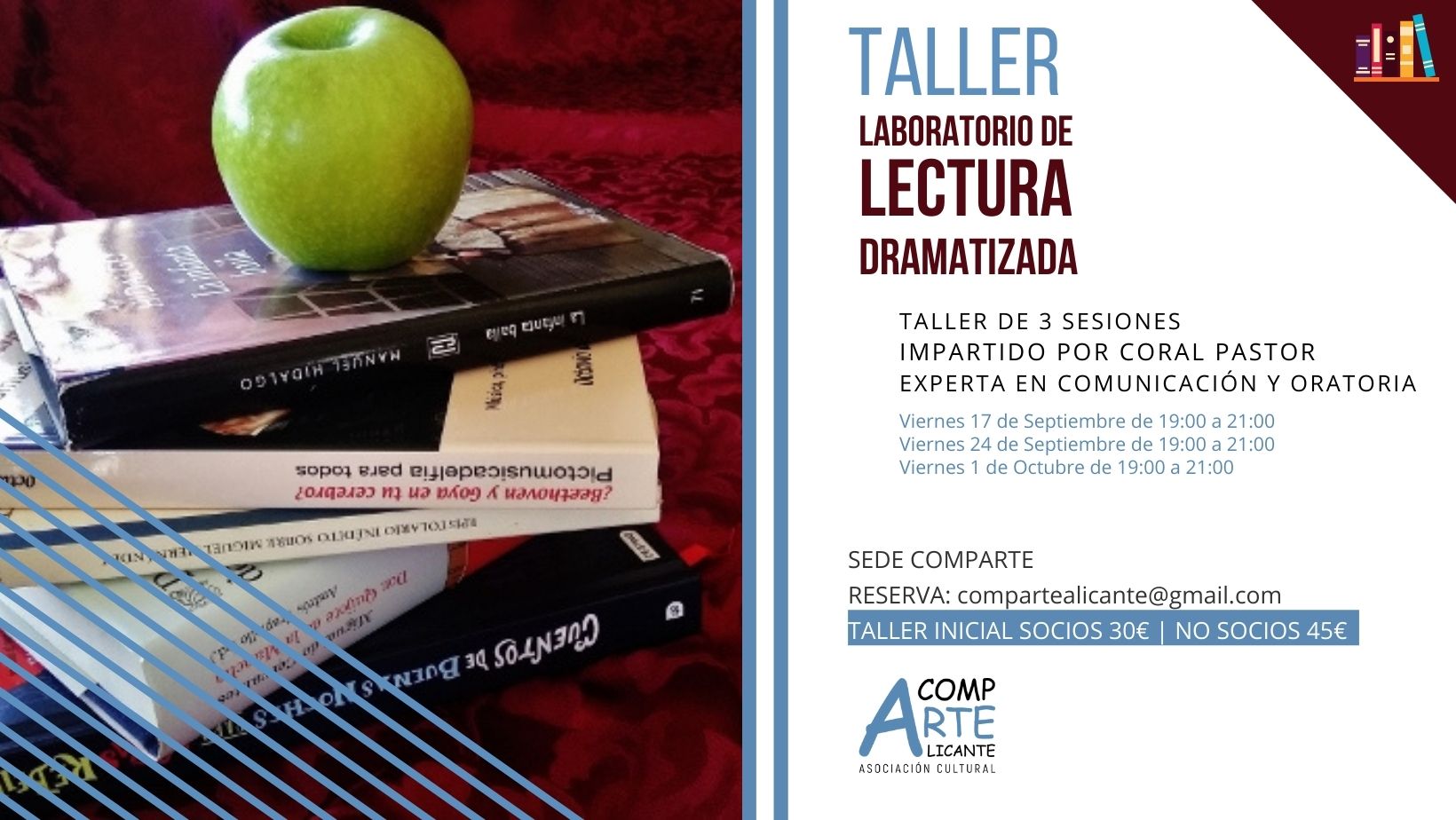 Concluimos el viernes 1 de Octubre a las 19:00 h. con la última sesión del Laboratorio de LECTURA DRAMATIZADA conducido por parte de Coral Pastor, creadora de su propia metodología ha desarrollado proyectos para comunicación, música, teatro, cine y televisión. Coral Pastor cursó Arte Dramático en la Escuela de Arte Dramático de Valencia y en biomecánica y el teatro como instrumento social de reflexión y provocación.