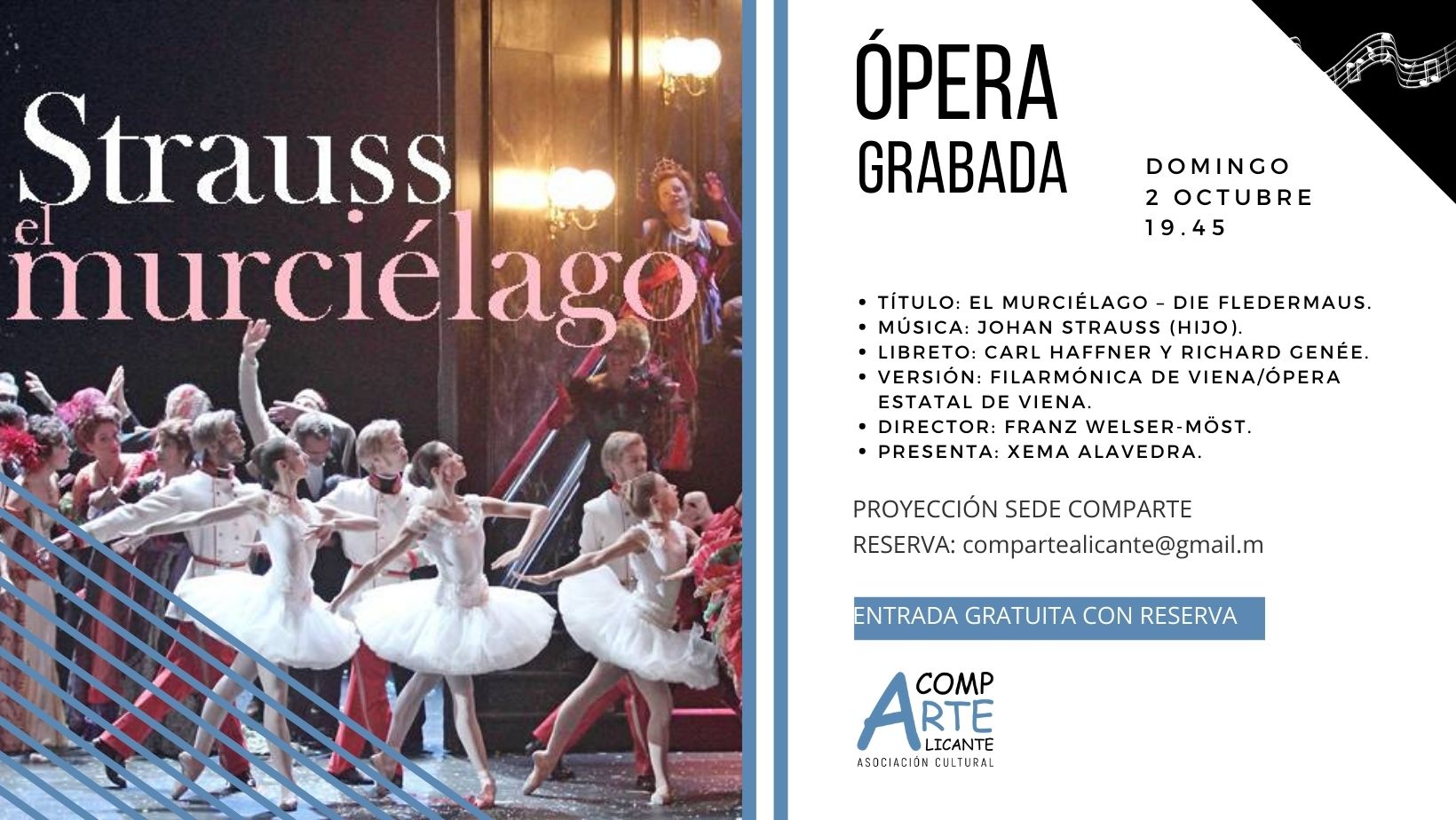 El próximo domingo 2 de octubre a las 19:45 horas, tenemos el placer de inaugurar la temporada de ópera grabada con «El Murciélago», presentada por nuestro socio Xema Alavedra amante de la ópera.