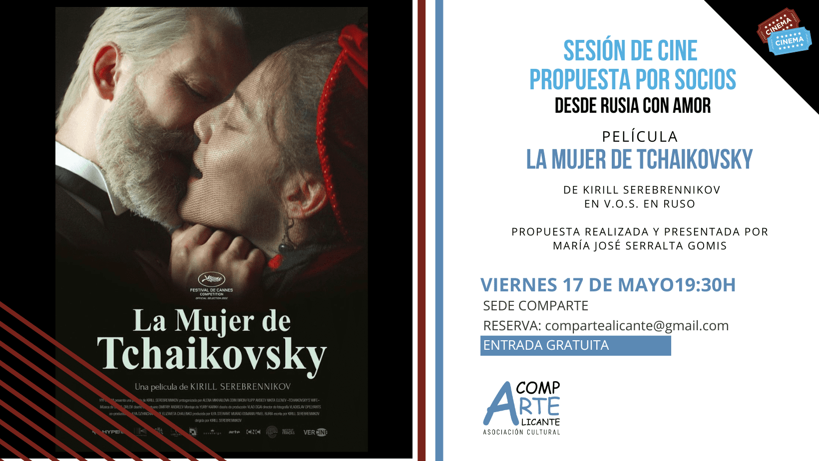 El próximo viernes 17 de mayo a las 19:30h. tenemos el placer de presentar una sesión de cine presentado por socia que en este caso lo hará nuestra socia y amiga María José Serralta, quien nos presentará la película Zhena Chaikovskogo (La mujer de Tchaikovsky) en V.O.S. en ruso, del director Kirill Serebrennikov.