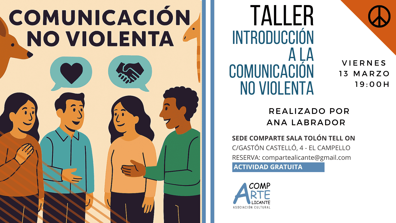 El próximo viernes 13 de marzo a las 19:00h te proponemos el nuevo taller: «Introducción a la Comunicación No Violenta», de la mano de nuestra amiga y socia Ana Labrador.