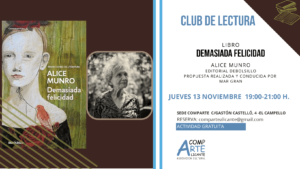 El jueves 13 de noviembre a las 19:00 horas, nos complace invitarte a un nuevo encuentro de nuestro club de lectura. En esta ocasión, se trata de la novela "Demasiada felicidad" de la autora canadiense Alice Munro.