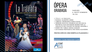 El jueves 4 de septiembre a las 19:30 horas, os proponemos la asistencia a la ópera La Traviata de Giuseppe Verdi, en versión de 2015 grabada en el Festspielhaus de Baden-Baden por la orquesta Balthasar-Neumann-Ensemble y proyectada en los cines Kinépolis Plazamar.