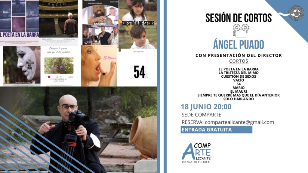 El próximo sábado 18 de junio a las 20.00 h tenemos el placer de presentar una sesión especial dedicada al director de cine Ángel Puado que nos presentará el trabajo del último año en el que se propuso producir un corto por mes, los mostrará como fue el trabajo viendo juntos una selección de estos cortos. ¡Reserva tu plaza!