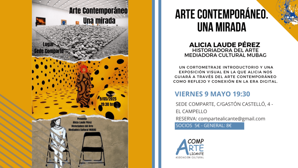 Descubre las claves del arte contemporáneo. El 9 de mayo a las 19:30h te invitamos a explorar las nuevas formas de expresión artística en la era digital, con la presentación de "Arte contemporáneo. Una mirada". Esta presentación estará a cargo de Alicia Laude Pérez, historiadora del arte y mediadora cultural del MUBAG, a propuesta de nuestra socia y secretaria de la asociación Mirna Pol. ¿Qué nuevas narrativas y conexiones surgen del arte en el siglo XXI? Inscríbete y acompáñanos en esta mirada al arte actual.