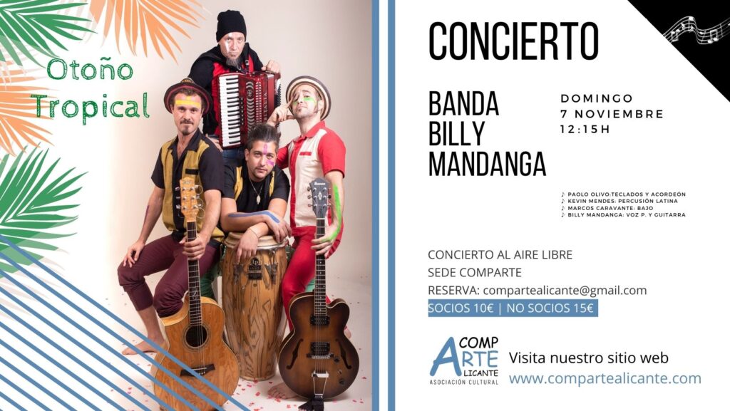 El próximo domingo 7 de noviembre en tenemos en exclusiva el CONCIERTO de Billy Mandanga y su banda con la que daremos la bienvenida a nuestro otoño tropical.
