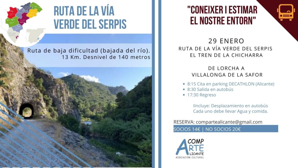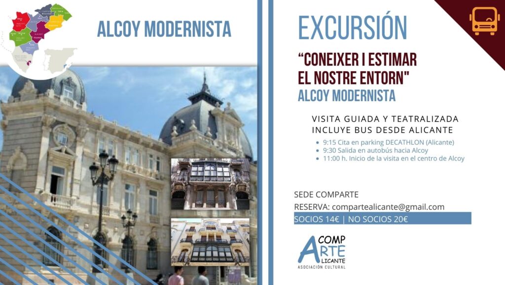 El próximo domingo 14 de noviembre os proponemos una excursión con visita guiada y teatralizada para conocer Alcoy. El objetivo de nuestra asociación es el fomento de la cultura y compartirla. Por ello, a petición de varias personas y gracias a que la cultura, como término polisémico, nos permite desarrollar actividades de toda índole, queremos inaugurar una sección que denominaremos “CONEIXER I ESTIMAR EL NOSTRE ENTORN”.
