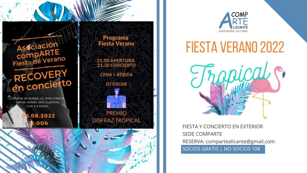 Ey! Un verano no es verano, hasta que no se monta una fiesta! El próximo sábado 6 de agosto a las 21.00 h todos los socios estáis invitados (previa inscripción) a la Fiesta del verano de la asociación CompARte. Por supuesto podéis traer acompañantes y amigos, pero a estos no les saldrá gratis la fiesta :-) ¡Privilegio de ser socios! El objetivo no es más que pasar una bonita velada veraniega, amenizada con el concierto en directo de los Recovery Rock Band, cena picoteo, bebida, y contaremos con la música de nuestro DJ Oscar ¡Reserva tu plaza!