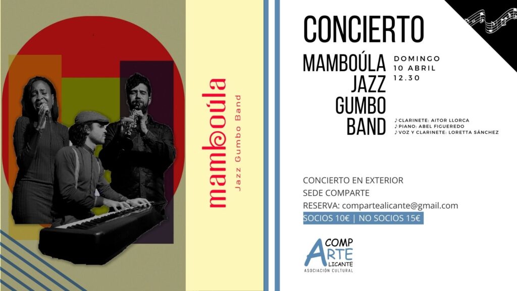 El próximo domingo 10 de abril a las 12:30 h tendremos un concierto de la mano de Mamboúla Jazz Gumbo Band, que nos hará olvidar los días grises y lluviosos, para disfrutar en el exterior de los mejores ritmos al ☀️.
