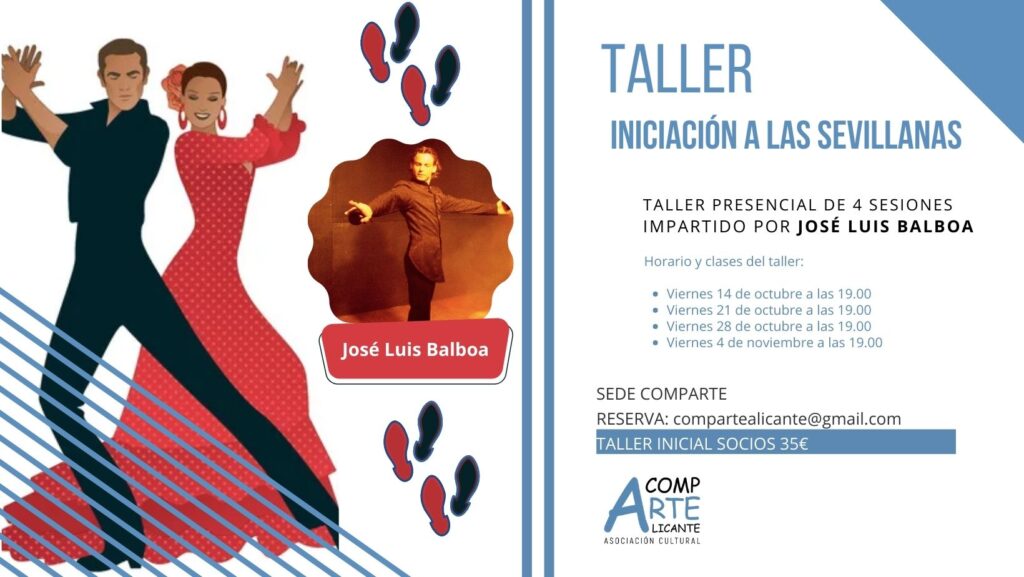 Tenemos el placer de anticipar el taller de 4 sesiones de iniciación a las sevillanas conducido por el profesor de baile José Luis Balboa. El taller es presencial y se compone de 4 sesiones de 1 hora. Horario y clases del taller: Clase 1: Viernes 14 de octubre a las 19.00 Clase 2: Viernes 21 de octubre a las 19.00 Clase 3: Viernes 28 de octubre a las 19.00 Clase 4: Viernes 4 de noviembre a las 19.00 ¡A bailar, a bailar y a bailar!