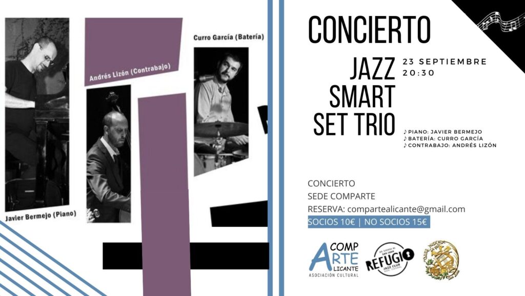 El próximo viernes 23 de septiembre a las 20.30 os proponemos un concierto de Jazz con el SMART SET TRIO, organizado en colaboración con el Refugio Club de Jazz, para disfrutarlo en la sede de Comparte