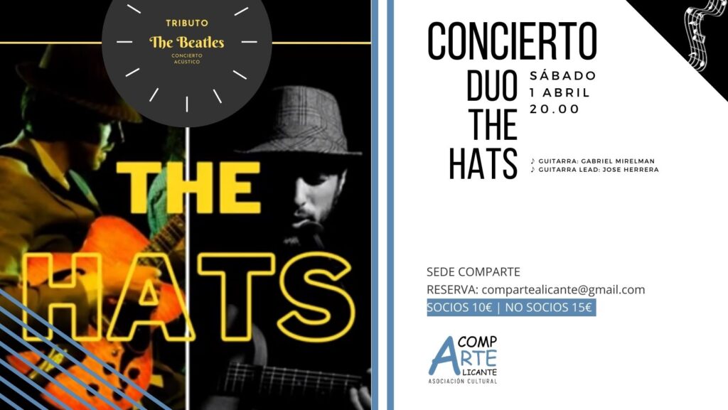 El próximo sábado tenemos 1 de abril a las 20:00 tenemos el placer de invitaros al concierto de The Hats donde disfrutaremos de un tributo acústico a The Beatles. Aportación socios: 10€ General : 15€ ¡Reserva ya tu plaza!